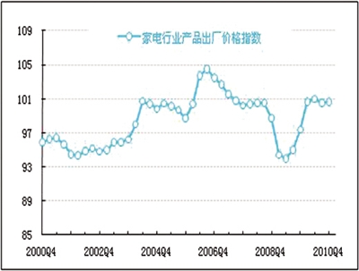2010年四季度,家电行业产品出厂价格同比上涨0.6%,与上季度相比微升0.1个百分点。由于本季度上游原材料、燃料、动力购进价格涨幅较大,加上家电行业加大淘汰高耗能家电产品的力度等多因素共同作用,家电行业价格整体水平有望在2011年呈上升趋势。
