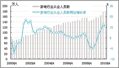 截止到2010年四季度末,家电行业全部从业人员数为181.4万人,同比增长15.7%,同比增速较上季度回落2.2个百分点。目前用工的增长仍处于高位,但受到产业结构调整和基数变动影响,预计2011年用工增速有可能出现回落。