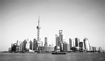 站在上海黄浦江边的外滩眺望浦东,阳光下,东方明珠熠熠生辉,陆家嘴金融贸易区高楼林立,这是一个生气勃勃的正在崛起的上海国际金融中心的缩影。
