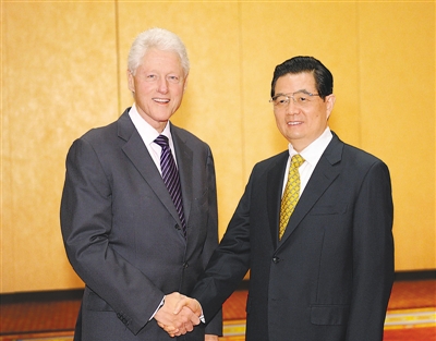 胡锦涛对克林顿为中美关系发展作出的重要贡献表示高度赞赏,指出中美建交30多年来,两国关系虽然历经风雨,但总体上不断向前发展。双方在各领域合作不断扩大,为两国人民带来实实在在的利益,为世界和平与发展作出贡献。事实证明,一个良好的中美关系,不仅符合两国和两国人民根本利益,而且有利于亚太乃至世界和平、稳定、繁荣。在当前形势下,中美两国拥有越来越多的共同利益。两国政治上要加强互信,经济上要加强合作,人民之间要加强往来,国际问题上要加强沟通和协调。中美关系发展得好,不仅中国人民高兴,美国人民高兴,亚太及世界各国人民也会高兴。我这次来访的目的是增进互信、加强友谊、深化合作,推动21世纪积极合作全面的中美关系继续向前发展。
