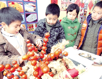 1月20日,浙江省上虞市鹤琴幼儿园的小朋友在制作“冰糖葫芦”。春节临近,鹤琴幼儿园的老师带领小朋友,利用废旧物品制作了500多件具有中国文化元素的节庆饰品,将幼儿园装点得年味十足。
