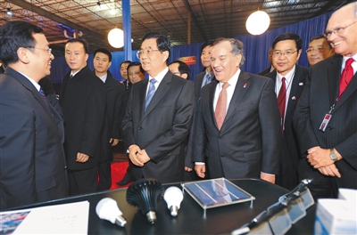 胡锦涛走进展区,来到展台前,仔细观看实物和展板,向有关企业负责人了解情况,并同企业美国员工亲切交谈。
