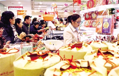 1月21日,顾客在上海第一食品商店内选购糖果。临近春节,上海节前市场的年货销售也渐入高峰。 新华社记者 刘 颖摄