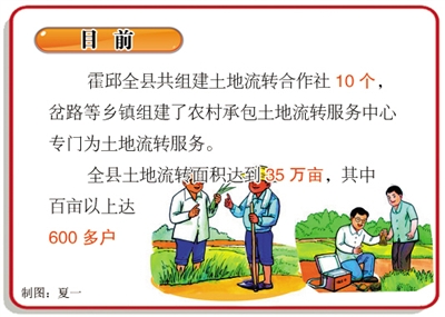 目前,霍邱全县共组建土地流转合作社10个,岔路等乡镇组建了农村承包土地流转服务中心专门为土地流转服务。全县土地流转面积达到35万亩,其中百亩以上达600多户。去年,县政府从财政专项安排中,一次性兑现土地流转种粮大户奖励资金400万元,促进了全县种粮大户的发展。