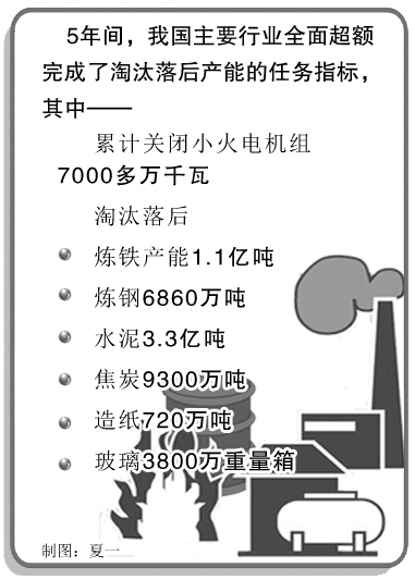 过去的五年中,环境保护以减排倒逼、政策引导和监管推动等多种方式,加快落后产能淘汰步伐、优化经济结构、促进绿色发展。5年间,累计关闭小火电机组7000多万千瓦,淘汰落后炼铁产能1.1亿吨、炼钢6860万吨、水泥3.3亿吨、焦炭9300万吨、造纸720万吨、玻璃3800万重量箱,主要行业全面超额完成了淘汰落后产能的任务指标。针对重金属污染、造纸企业、污水处理厂和垃圾填埋场等重点问题开展专项检查,检查企业468万多家次,查处环境违法企业14万多家次,取缔关闭违法排污企业2万多家。在节能减排的高压下,环境保护的倒逼机制更好地推动了经济结构调整和产业转型升级。