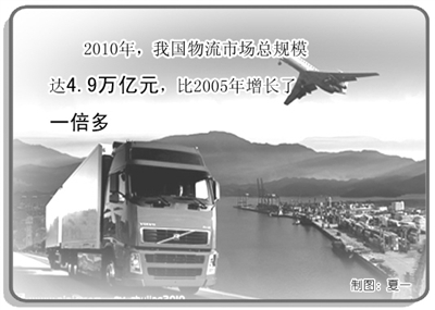 新年伊始,由中国物流与采购联合会与中国物流学会共同主办的“2011中国物流发展报告会”发布的一组数据,让人眼前一亮:“十一五”时期,社会物流需求加快增长,物流市场规模不断扩大。2010年,我国物流市场总规模达4.9万亿元,比2005年增长了一倍多。“十一五”期间物流产业发展的经济政策环境大大改善,2006年我国开始实施的“十一五”规划纲要中,突出强调“大力发展现代物流业”,物流业的产业地位首次在国家规划层面得以确立。2009年,我国又出台了首个全国性物流业专项规划《物流业调整和振兴规划》。“十二五”期间,我国物流业又面临着新的发展机遇,物流业将由此进入快速发展的黄金时期。