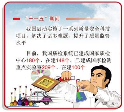 “十一五”期间,我国启动实施了一系列质量安全科技项目,解决了诸多难题,提升了质量监管水平。目前,我国质检系统已建成国家质检中心180个、在建148个,已建成国家检测重点实验室209个、在建100个。实验室总建筑面积达124万平方米,检测仪器设备价值140多亿元,为保障我国产品质量安全提供了坚强的后盾。