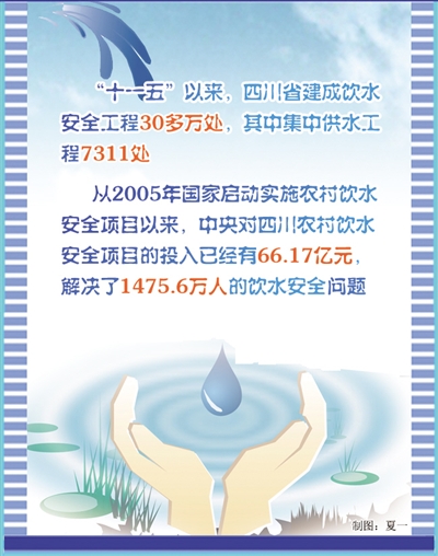 四川省农水局提供的数字显示,“十一五”时期,全省建成了这样的饮水安全工程30多万处,其中集中供水工程7311处。从2005年国家启动实施农村饮水安全工程以来,中央对四川农村饮水安全项目的投入已经有66.17亿元,解决了1475.6万人的饮水安全问题。