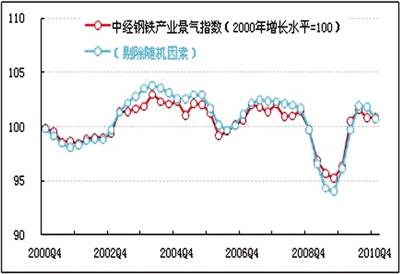 景气:2010年四季度中经钢铁产业景气指数①为100.8点(2000年增长水平=100②),与上季度持平③,上季度初现的回落势头并未得以延续。