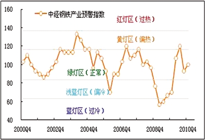 中经钢铁产业景气指数显示,2010年四季度,钢铁产业景气指数为100.8点,与上季度持平。中经钢铁产业预警指数为100.0点,较上季度回升6.7点,达到“绿灯区”中心线。