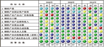 灯号:2010年四季度,在构成中经钢铁产业预警指数的10个指标(仅剔除季节因素,保留随机因素)中,位于“红灯区”的有1个指标——钢铁产业利润合成指数;位于“黄灯区”的有2个指标——钢铁产业产品出厂价格指数和钢铁产业从业人员数;位于“绿灯区”的有4个指标——钢材产量、钢材出口额、钢铁产业产品销售收入和钢铁产业产成品资金占用(逆转⑥);位于“浅蓝灯区”的有2个指标——钢铁产业固定资产投资总额和钢铁产业税金总额;位于“蓝灯区”的有1个指标——钢铁产业应收账款净额(逆转)。