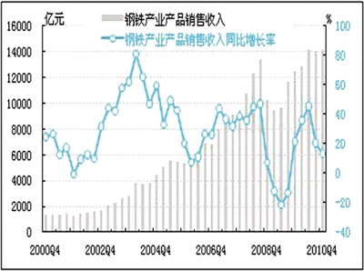 经初步季节调整,2010年四季度我国钢铁产业产品销售收入为14202.5亿元,同比增长13.6%,增速较上季度回落7.3个百分点;环比上升0.6%,上季度为环比下降0.2%。