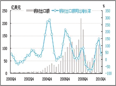 经初步季节调整,2010年四季度钢材出口额为85.0亿美元,同比增长35.2%,同比增速较上季度下降112.8个百分点;环比下降25.7%,上季度为环比上升16.7%。这是自2009年四季度以来,钢材出口额增速(包括同比和环比)的首次回落。