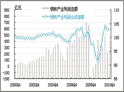 在铁矿石价格高位企稳和钢材价格回升的双重作用下,钢铁行业盈利情况有所好转。经初步季节调整,2010年四季度钢铁产业利润总额为392.3亿元,同比增长9.9%,环比上升71.2%,同比及环比增速均大幅扭转上季度出现的下降势头。钢铁行业销售利润率也从上季度极低的1.6%回升到本季度的2.8%,不过仍处于全国工业领域最低水平。