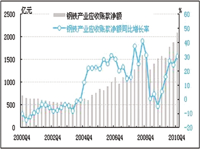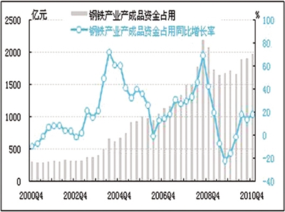 截至2010年四季度末,钢铁产业产成品资金占用为1989.8亿元,同比上升18.5%,增速较上季度加快4.5个百分点。