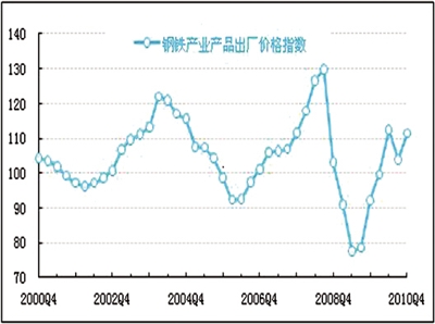 2010年四季度,钢铁产业产品出厂价格同比上涨11.4个百分点,涨幅较上季度扩大7.4个百分点,价格指数重回上升势头。