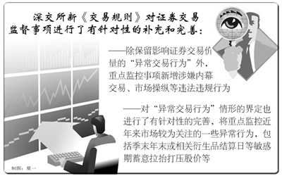 一是调整了ST类股票异常波动触发指标,将原有两套触发标准(连续三个交易日内日收盘价涨跌幅偏离值累计达到±15%以及连续三个交易日收盘价达到涨跌幅限制价格)统一为偏离值累计指标,并将指标调整为±12%;二是由于深圳市场挂牌上市交易的证券数量已比2006年大大增加,因此本次修订将证券公开信息披露的范围由前三只证券扩大为前五只;三是明确了无价格涨跌幅限制股票交易盘中临时停牌的相关指标;四是根据交易所近几年市场监管的实际情况,进一步完善和明确了重点监控的事项,新增了异常交易情形的具体描述;五是当发生交易异常情况时,增加了交易所暂缓进入交收的有关处理措施;同时,针对交易所可能因特殊事件而临时停市的情形,新增了深交所可根据证监会要求临时停市的条款。