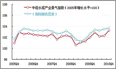 景气:2010年四季度,中经水泥产业①景气指数为103.3(2005年增长水平=100②),较上季度上升1.0点,表现为平稳上升态势。