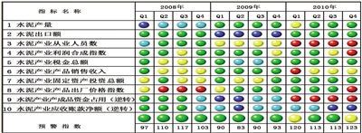 灯号:2010年四季度,在构成中经水泥产业预警指数的10个指标(仅剔除季节因素,保留随机因素)中,位于“绿灯区”的有4个指标,即水泥产量、水泥出口额、水泥产业税金总额及固定资产投资总额;位于“黄灯区”的有1个指标,即水泥产业产品销售收入;位于“蓝灯区”的有1个指标,即水泥产业应收账款净额(逆转);位于“红灯区”的有4个指标,即水泥产业从业人员数、利润合成指数、产品出厂价格指数及产成品资金占用(逆转)。与上季度相比,水泥产业利润合成指数由“黄灯”转为“红灯”,水泥产业产品出厂价格指数由“绿灯”变为“红灯”,其他指标灯号不变。