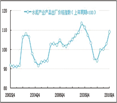 2010年四季度水泥产品出厂价格同比上涨9.1%,涨幅较上季度扩大6.1个百分点。