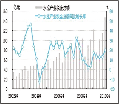 经初步季节调整,2010年四季度,我国水泥产业税金总额为147.6亿元,比上季度增加31.9亿元,同比增长20.1%,同比增速较上季度加快6.9个百分点;环比增长27.6%,环比增速较上季度加快14.3个百分点。