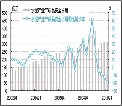截至2010年四季度末,水泥产业产成品资金占用额为309.7亿元,比上季度下降1.4亿元,同比下降18.7%。水泥产业产成品资金占用从2009年三季度同比增长61.1%之后连续5个季度快速下滑。