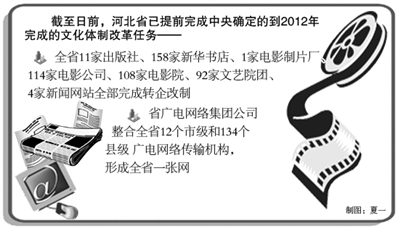 目前,全省已提前完成中央确定的到2012年完成的文化体制改革任务。全省11家出版社、158家新华书店、1家电影制片厂、114家电影公司、108家电影院、92家文艺院团、4家新闻网站全部完成转企改制;省广电网络集团公司整合全省12个市级和134个县级广电网络传输机构,形成全省一张网。
