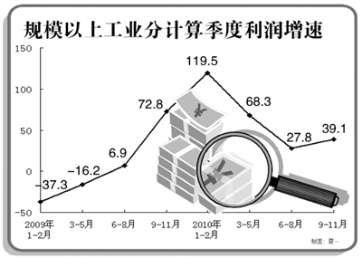 1-11月份,全国规模以上工业企业实现利润38827.9亿元,同比增长49.4%,比上年同期提高41.6个百分点。其中,1-2月、3-5月、6-8月、9-11月同比分别增长119.5%、68.3%、27.8%和39.1%。