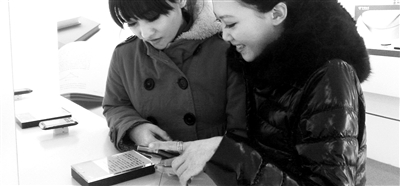 上图:3G智能化终端扩展了手机的应用范围。图为两位用户正在体验手机阅读功能。 谭 辛摄