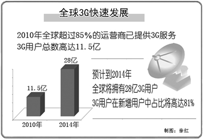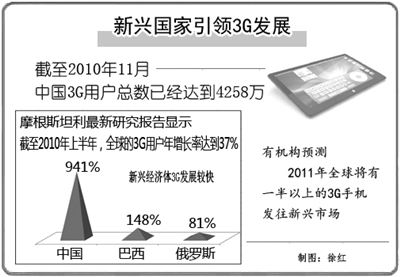 新兴经济体正在为3G的快速发展做出重要贡献。在中国,截至2010年11月,3G用户总数已经达到4258万。根据摩根斯坦利最新研究报告,截至2010年上半年,全球的3G用户年增长率为37%,而中国是941%,巴西为148%,俄罗斯为81%。有机构预测,2011年全球将有一半以上的3G手机发往新兴市场。