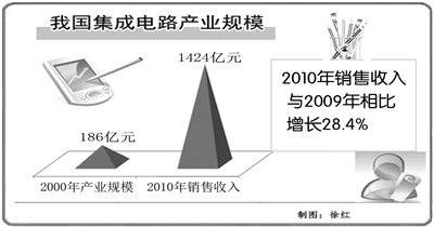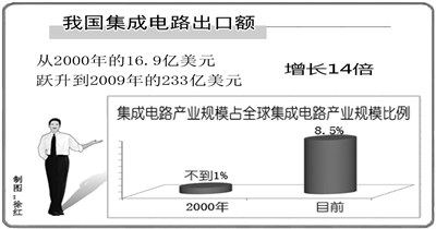 十年间,我国集成电路产业规模持续扩大,统计数据显示,我国集成电路产业规模从2000年的186亿元发展到2009年的千亿元级别,2010年销售收入达1424亿元,较上年增长28.4%。出口额从2000年的16.9亿美元跃升到2009年的233亿美元,增长了14倍。集成电路产业规模占全球集成电路产业比例从2000年的不到1%上升到目前的8.5%。