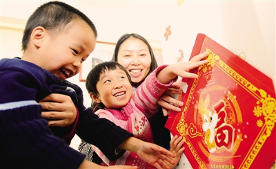 1月26日,北京大兴区SOS儿童村,志愿者和孩子们一起贴福字、做游戏,一片欢声笑语。当天正值农历小年,北京团市委组织志愿者在儿童村开展“情暖京城送爱心”志愿服务活动。