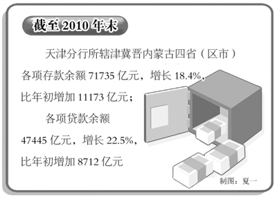 2010年以来,随着我国经济平稳较快发展势头逐步巩固,根据人民银行总行的部署和要求,天津分行及时调整工作思路,将执行适度宽松货币政策的重心转向“保增量、控节奏、调结构、抓创新、防风险”,切实把握好政策实施的力度、节奏和重点,保持了金融对辖区经济发展的持续支持。截至2010年末,天津分行所辖津冀晋内蒙古四省(区市)各项存款余额71735亿元,增长18.4%,比年初增加11173亿元;各项贷款余额47445亿元,增长22.5%,比年初增加8712亿元。