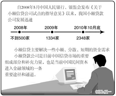 1月6日,中国小额信贷机构联席会议在京举行,据会议发布的《2010中国小额信贷蓝皮书》披露,自2008年5月中国人民银行、银监会发布《关于小额信贷公司试点的指导意见》以来,中国小额贷款公司发展迅速,公司数量由2008年底的不到500家,发展到2009年的1334家,到2010年10月已达2300多家。