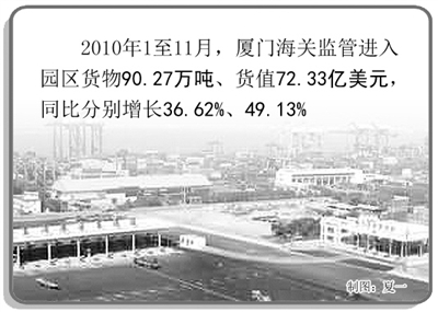 据介绍,象屿保税物流园区自封关以来,充分发挥了园区的功能优势,不断创新业务模式,真正起到了厦门市经济特区和海西经济区参与国际竞争服务的“平台”作用。目前,园区内汇聚了30多家国内外知名物流企业和20多家海峡两岸知名进出口企业。2010年1至11月,厦门海关监管进入园区货物90.27万吨、货值72.33亿美元,同比分别增长36.62%、49.13%。