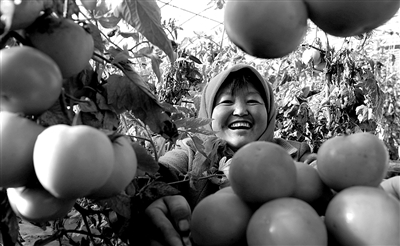 1月11日,陕西省靖边县东坑镇黄家峁村村民高俊梅正在自家的温棚里采摘西红柿。