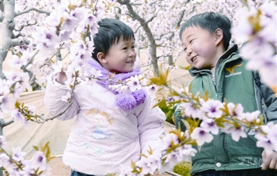 图为两位小朋友在温室大棚中的桃花间玩耍。