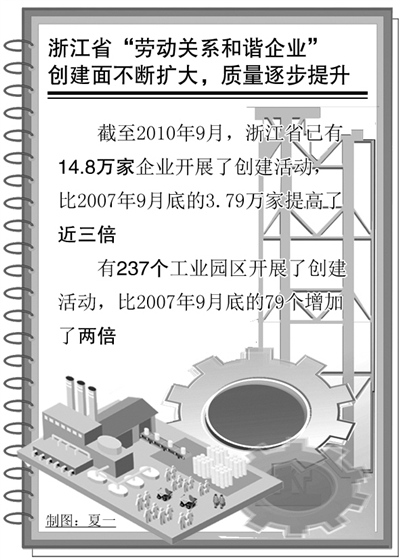 2006年,浙江开始在全省开展“创建劳动关系和谐企业”活动。为促进企业的自觉和主动、吸引广大劳动者的参与和互动,浙江省总工会提出了“宣传开路、活动搭台、文化唱戏、服务全局”的总体思路,通过精心策划宣传,大力总结推广典型经验,广泛开展宣传和谐劳动关系的文化活动,营造了良好的社会氛围,优化了工作环境,有力推动了和谐劳动关系的构建。“劳动关系和谐企业”创建面不断扩大,质量逐步提升。截至2010年9月,浙江省已有14.8万家企业开展了创建活动,比2007年9月底的3.79万家提高了近三倍;有237个工业园区开展了创建活动,比2007年9月底的79个增加了两倍。