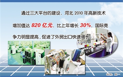 通过三大平台的建设,河北2010年高新技术增加值达820亿元,比上年增长30%,国际竞争力明显提高,促进了外贸出口快速增长。