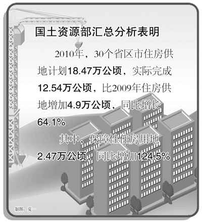 为贯彻落实国务院有关房地产调控精神,稳定房地产市场预期,国土资源部2010年初组织各地首次编制指导性的城市住房用地供应计划并于4月上旬向社会公布。国土资源部近日汇总分析表明,2010年住房用地供应大幅增长,供地计划总体执行情况较好。30个省区市(不含西藏和新疆生产建设兵团)住房供地计划18.47万公顷,实际完成12.54万公顷,比2009年住房供地增加4.9万公顷,同比增长64.1%。其中,保障性住房用地2.47万公顷,同比增加124.5%。与前几年的供地情况同口径相比,保障性住房、中小套型普通商品房和其他住房实际用地10.89万公顷,同比增长42.5%。