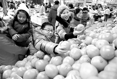 1月29日,顾客在北京市丰台区北甲地综合市场选购水果。春节临近,北京各农副产品批发网点和各大市场供应充足、品种丰富。