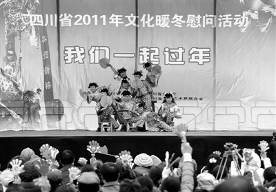 图1:这是文艺表演的现场(1月21日摄)。当日,由四川省委宣传部、省文化厅、省交通运输厅和省文联主办的以“我们一起过年”为主题的文化慰问活动在绵竹市清平乡泥石流灾区拉开帷幕。 新华社记者 李桥桥摄