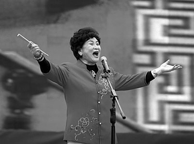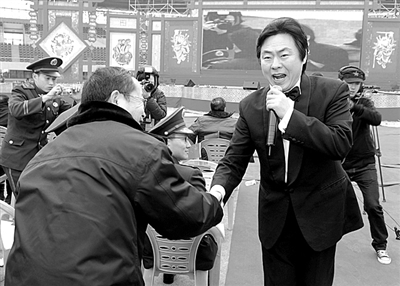 图5:1月26日,中国音乐学院教授、歌唱家丁毅在演出中与观众互动。当日,中国文联“送欢乐、下基层”慰问演出在四川绵竹地震灾区举行。