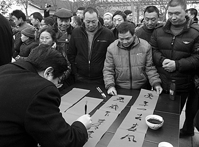 图4:1月26日一早,中国书法家协会的艺术家们就来到四川绵竹金花镇玄郎村,用书法歌颂和赞美灾后重建的社会主义新农村。彭 宽摄
