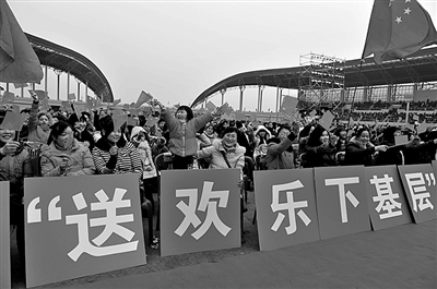 2011年1月25日晚,中国文联“送欢乐、下基层”慰问团的艺术家们抵达年画之乡——四川绵竹,这已是中国文联“送欢乐、下基层”活动走过的第6个年头。一路欢歌一路情,6年来,艺术家们怀着百花回报沃土、艺术奉献人民的情怀,带着对艺术的执著与对群众深深的情谊,深入到农村、矿区、灾后恢复重建地区……为革命老区、边远地区、贫困地区和灾区的群众送去新年的关爱和祝福。