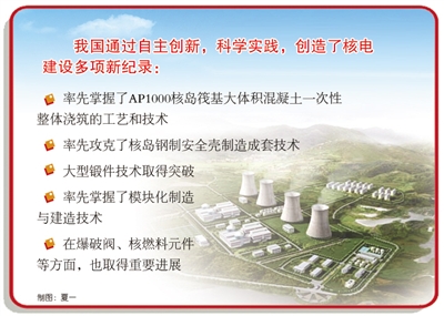 在世界最先进核电技术由图纸转化为工程实践的过程中,我国通过自主创新,科学实践,创造了核电建设多项新纪录:率先掌握了AP1000核岛筏基大体积混凝土一次性整体浇筑的工艺和技术,保证了工程质量,缩短了主工期,对在建的二代核电项目产生了积极的影响;率先攻克了核岛钢制安全壳制造成套技术,解决了多曲率钢板模压一次成型及吊装运输的难题;率先掌握了模块化制造与建造技术,实现了土建和安装交叉作业。