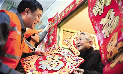 1月30日,北京市西城区金融街保洁一队清洁工人来到该区新文化街167号87岁的居民姚佳荣(右)家,送上新春联及福字等进行慰问。该保洁队14年来坚持为孤寡老人捐款捐物献爱心。 本报记者 李景录摄