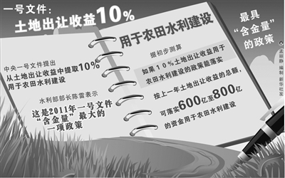 《中共中央国务院关于加快水利改革发展的决定》作为今年中央一号文件已经公布,这是新世纪以来中央指导农业农村工作的第八个中央一号文件。陈雷说,这是新中国成立以来中央出台的第一个水利综合性政策文件,是指导当前和今后一个时期水利改革和发展的纲领性文件。