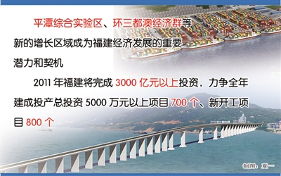 新的增长区域成为福建经济发展的重要潜力和契机。2011年福建将完成3000亿元以上投资,力争全年建成投产总投资5000万元以上项目700个、新开工项目800个。平潭综合实验区、环三都澳经济群、闽江口城市和工业群等都将成为福建未来若干年发展的生力军。在继续抓好第一批22个小城镇综合改革建设试点的同时,2011年全省将再增加20个试点镇。通过加快规划设计、全面推进基础设施、市政公用事业、环境景观建设、加大试点政策实施力度,促进试点镇的经济社会发展和群众生活水平进一步提高。