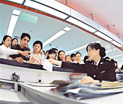 8:30上班时间一到,关员们刚整齐地坐在报关窗口,一沓沓的报关单就如雪片般递进来,叫号声、打单声、电话铃声此起彼伏。小王是业务能手,他的工作是审单,他细致核对单证、签字、盖章……一连串业务动作十分熟练。